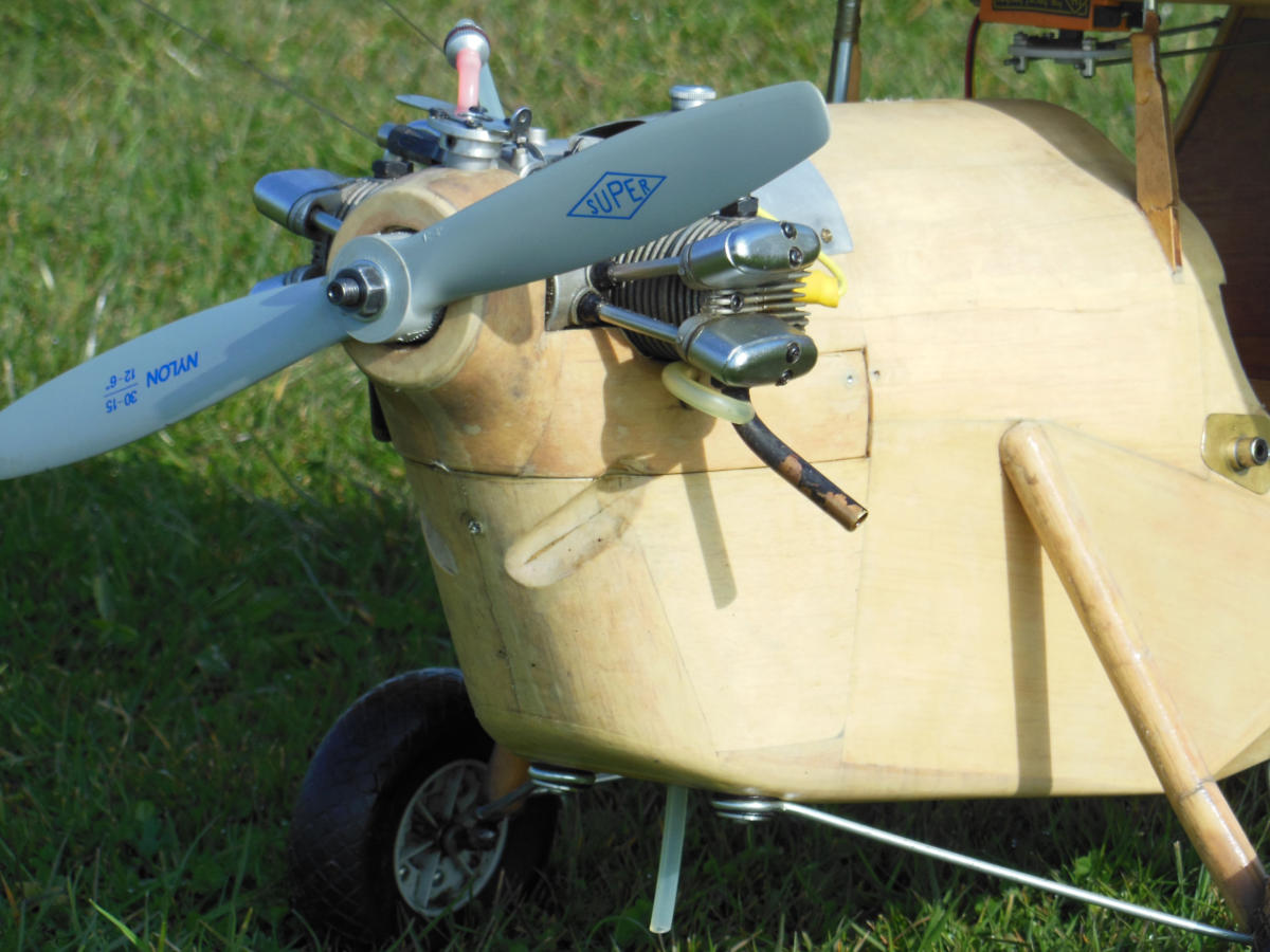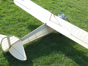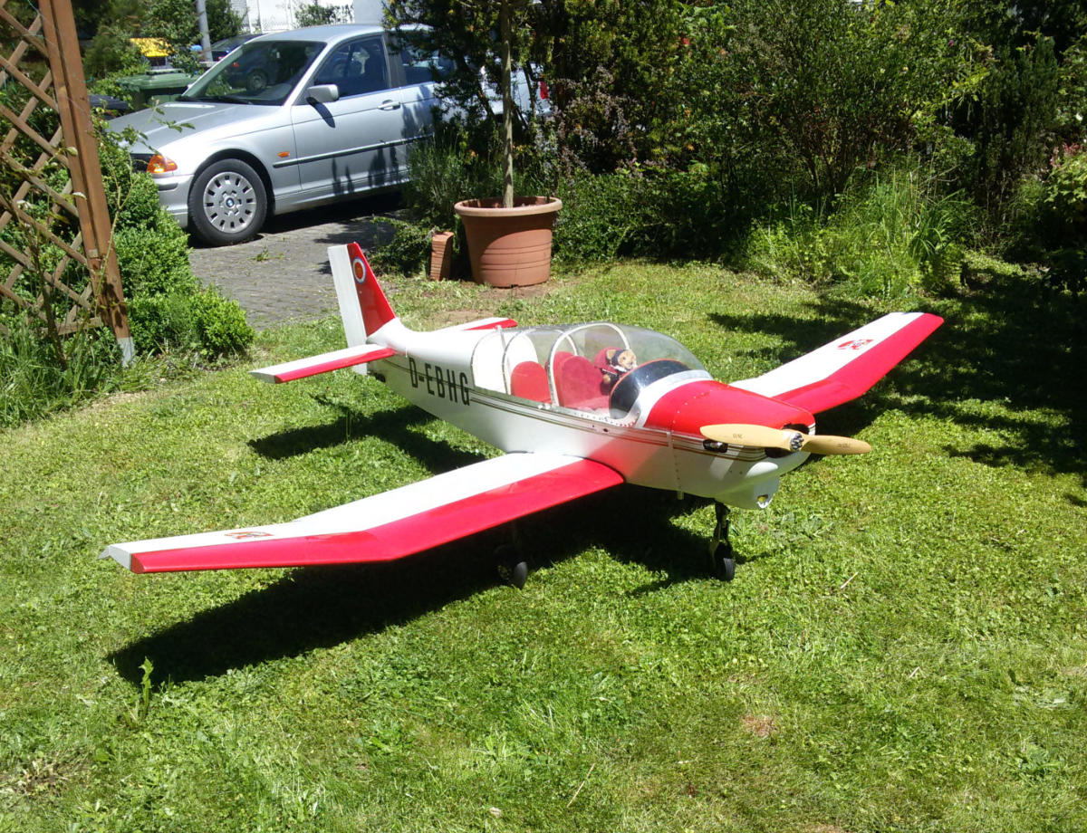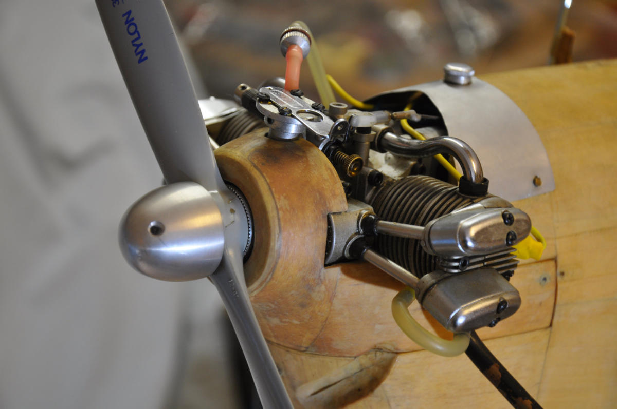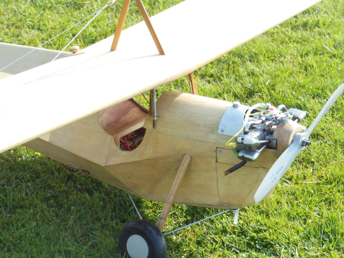 Hannibal von FlairHolz-Rippenauweise, teilweise beplankt. Super-Tartan 22, umgebaut auf Benzin mit Zündung. Er springt seitdem zuverlässig an, läuft gleichmäßig und hat einen leisen sonoren Ton mit dem grossen Bananendämpfer. Motorhaube ist inzwischen fertiggestellt, die Ausschnitte von früheren Motoren mit selbst formgepressten, in Holzform gehämmerten Blechen mit Nieten verschlossen.. Sieht authentisch aus. Spannweite 240 cm, Gewicht um 5 kg.Startet willig, fliegt langsam, lässt sich auch durch eine Böe nicht aus der Ruhe bringen. Bestes Anfängermodell.Kann bei Starkwind rückwärts fliegen.