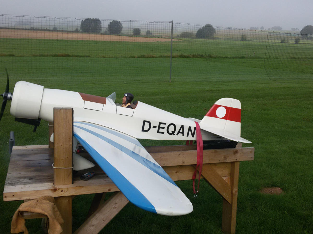Liebevoll gefertigtes Modell in Holzbauweise.Spannweite 160 cmLänge 95 cm ?Gewicht 2400 gMotor Saito Twin FA80 Methanol Glühzünder, ein Vergaser für beide Zylinder Motorleistung reicht gerade zum Starten, im Flug kann man Gas zurücknehmen. Besonderheit: langsam laufende Servos, dadurch ist die Kraft verstärkt.